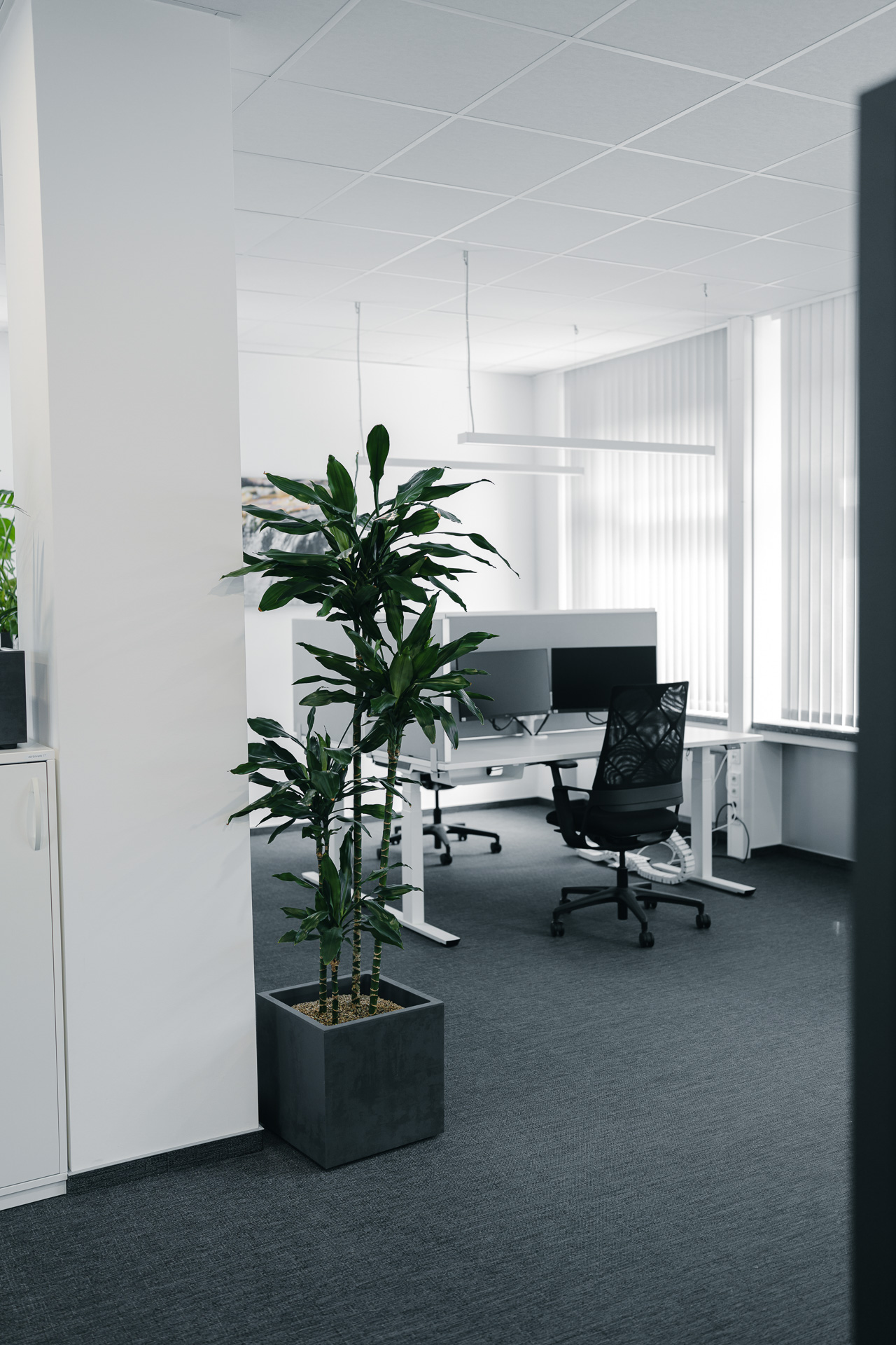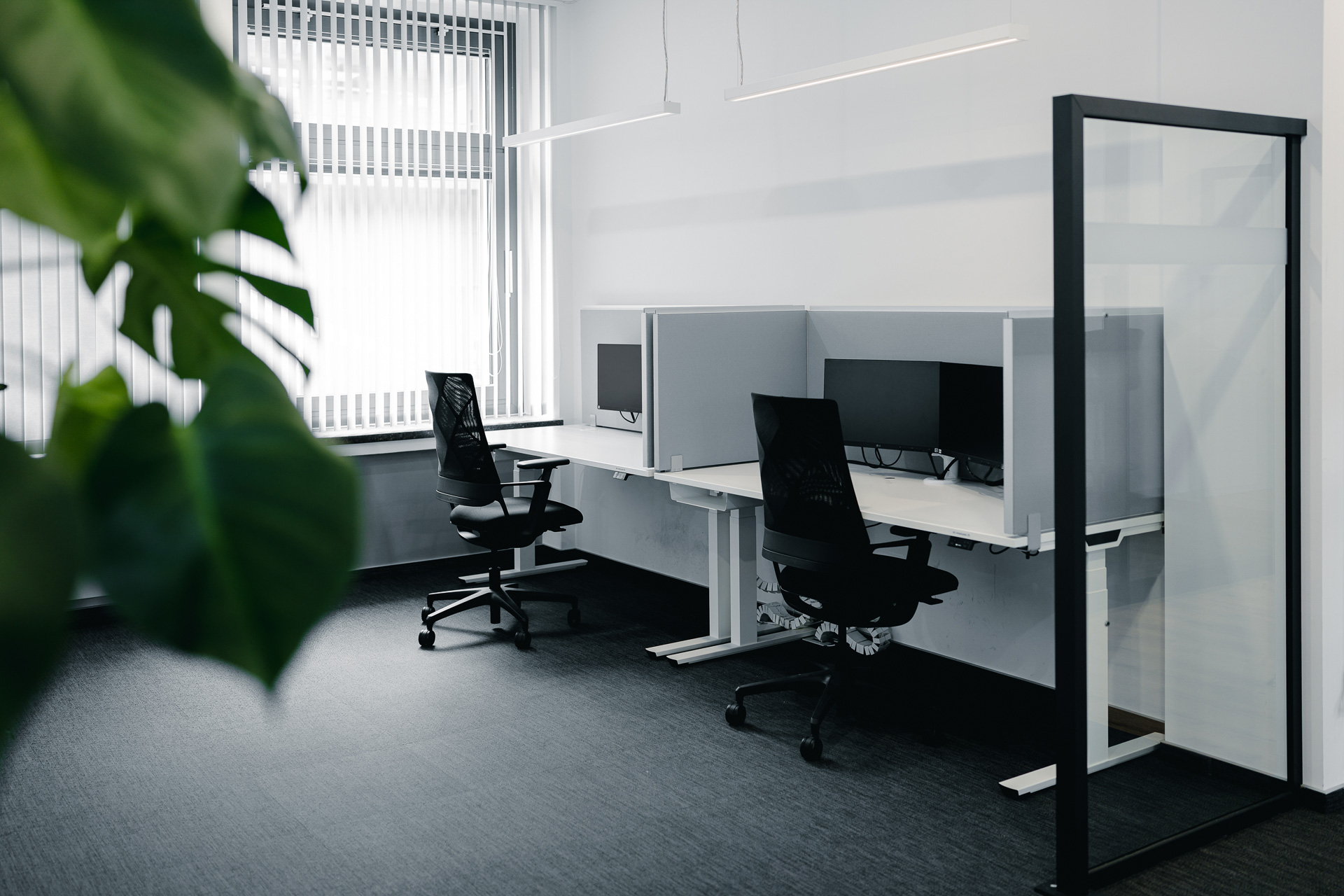 Praktische Details wie Tray-Schubladen und flexible Monitorarme (Space Arm, adapt global Group) erhöhen die Ergonomie und Organisation zusätzlich. In den Besprechungsräumen sorgt hochwertige Sedus-Bestuhlung für Komfort und ein stimmiges Gesamtbild, dass sich auf allen Etagen wiederfindet.
